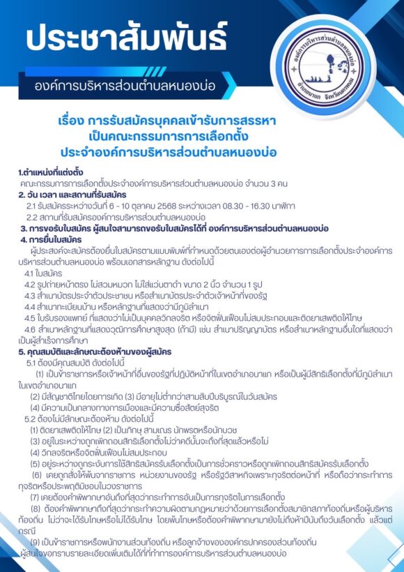 ประชาสัมพันธ์ เรื่อง การรับสมัครบุคคลเข้ารับการสรรหาเป็นคณะกรรมการการเลือกตั้ง องค์การบริหารส่วนตำบลหนองบ่อ ดูรายละเอียด..