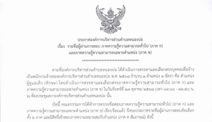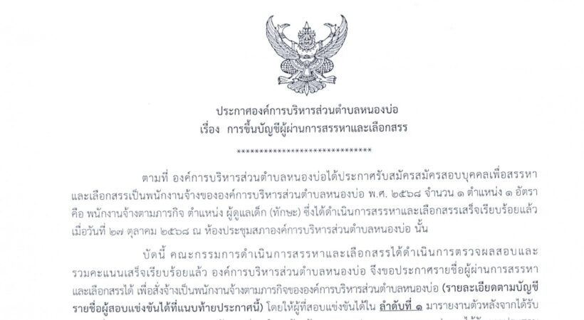 ประกาศรายชื่อผู้มีสิทธิเข้ารับการสรรหาและเลือกสรรเป็นพนักงานจ้างขององค์การบริหารส่วนตำบลหนองบ่อ ดูรายละเอียด..